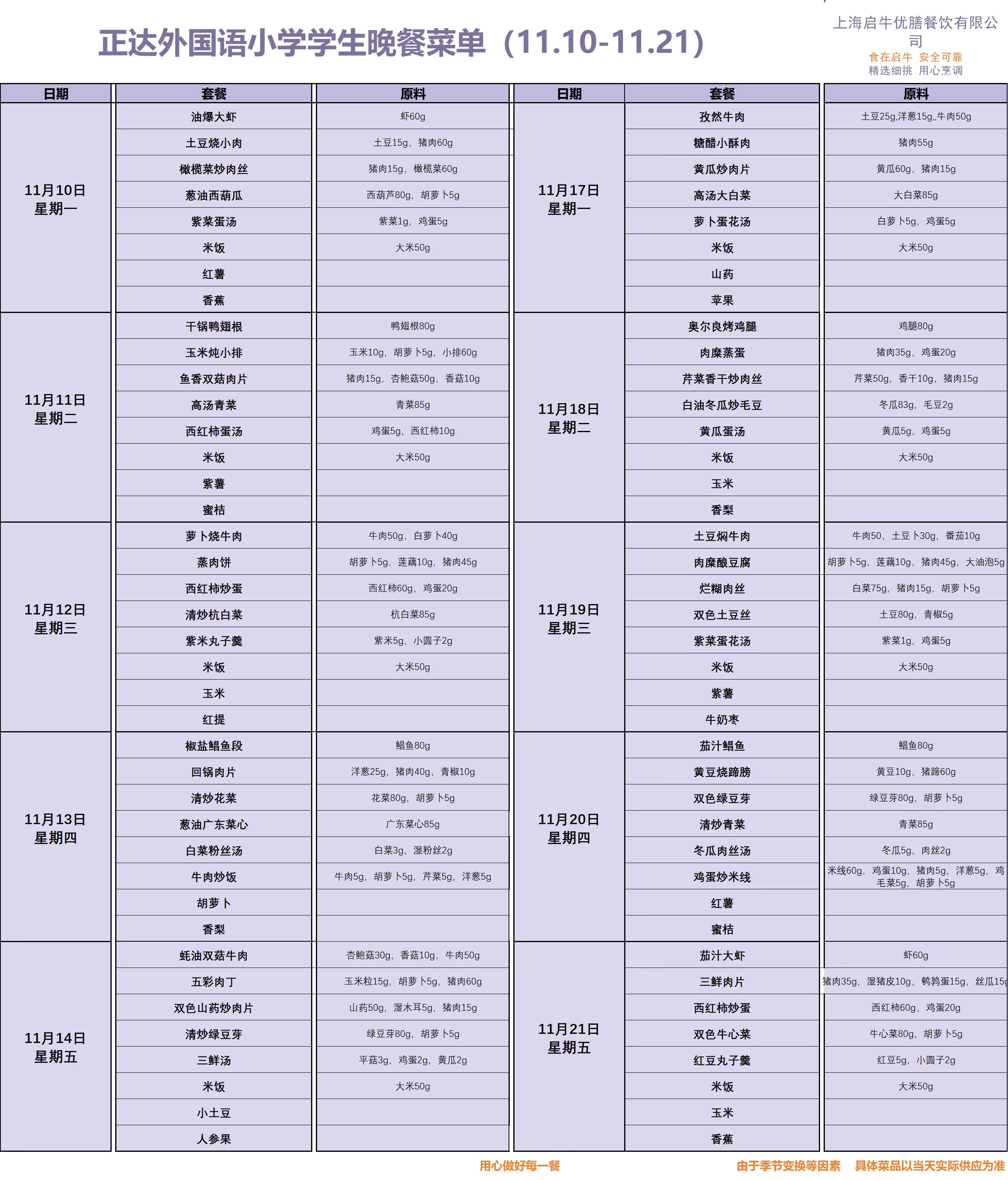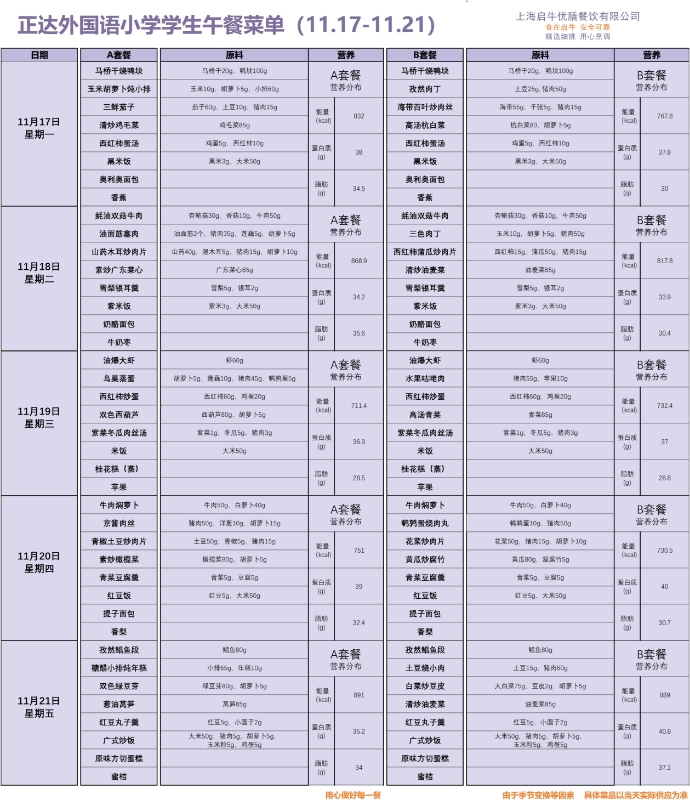 正达外国语小学周菜单11.10-11.21