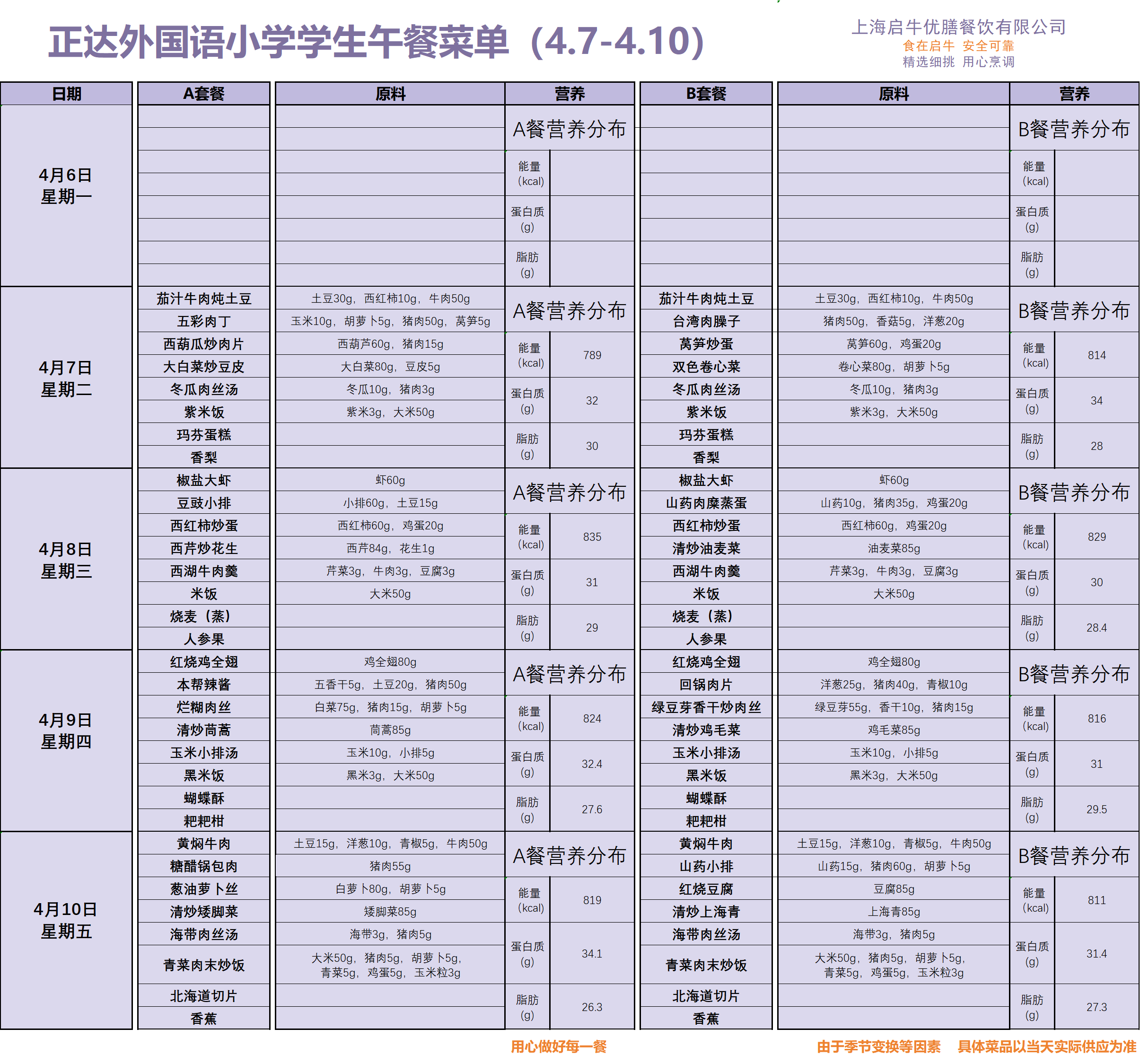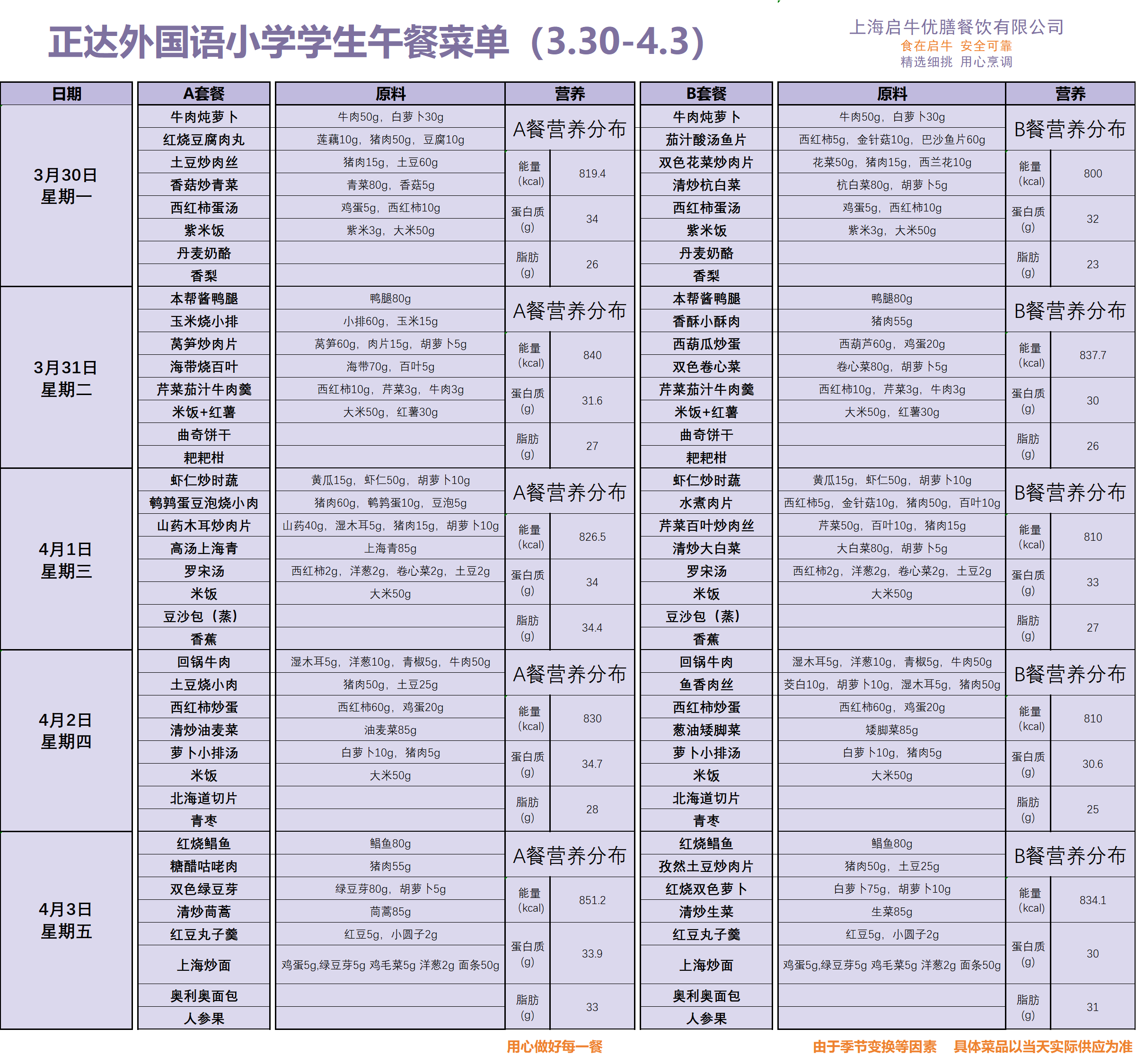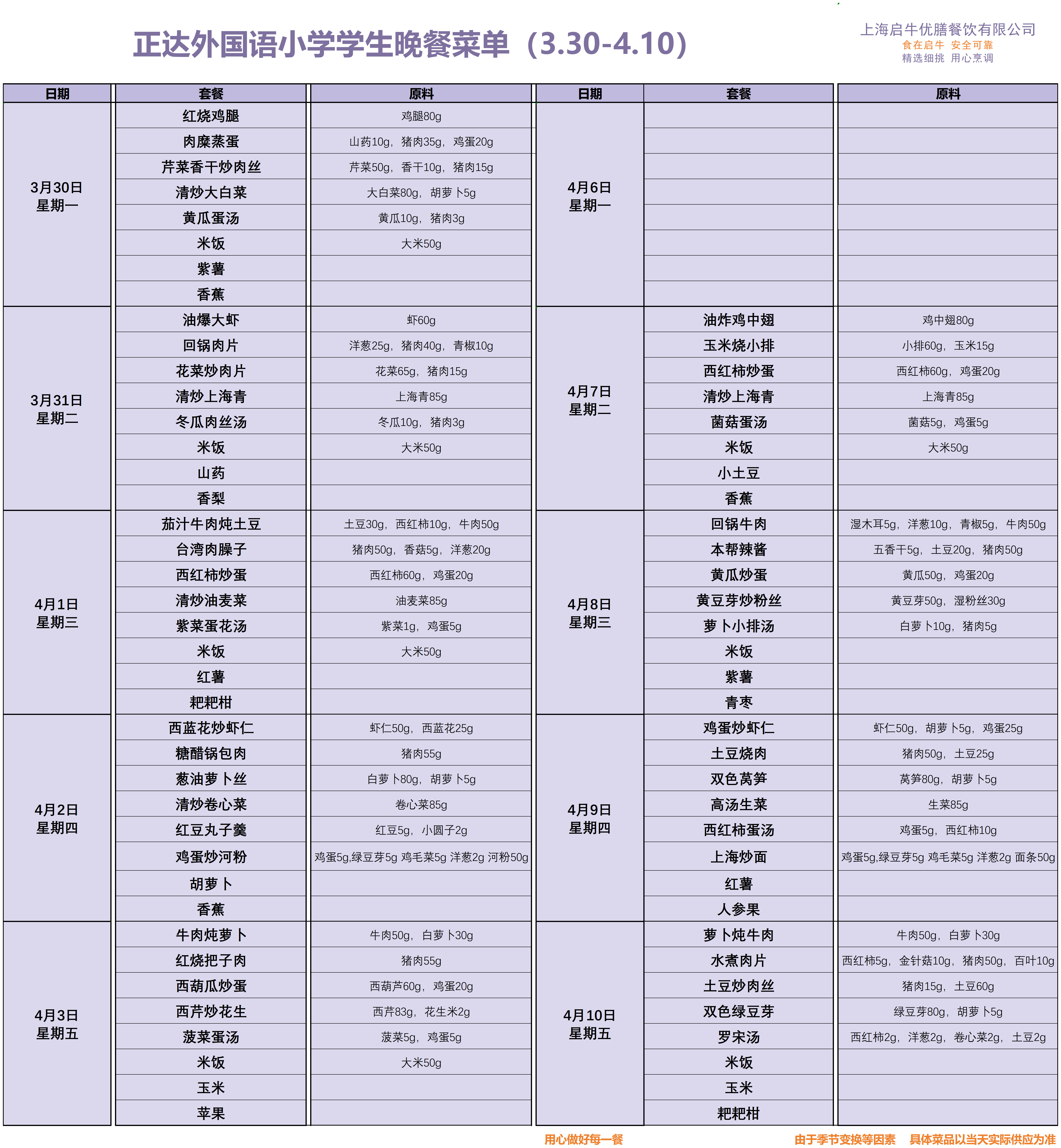 正达外国语小学菜单3.30-4.10